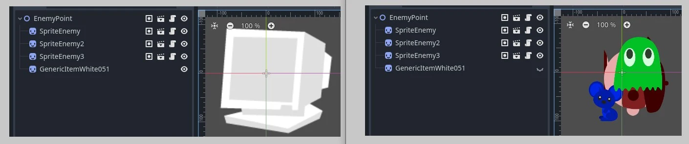 Ahora empieza lo más laborioso, heredar todos los enemigos y configurar sus parámetros para que se asomen lo justo y necesario. Fueron en total 3 ratones, 3 fantasmas y 2 ladrones con los que se crearon 10 Enemy_point distintos.
