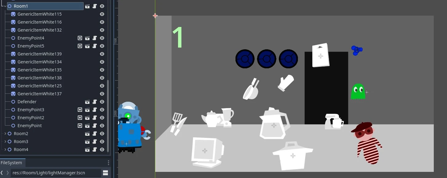 Unas vez listos todos los Enemy_point, toca crear las 5 habitaciones con las alarmas, un número para diferenciarlas, un fondo y los Enemy_point suficientes para rellenar la pantalla. Esto lo hice directamente en la escena main pero quizás habría sido mejor crear una escena por habitación.