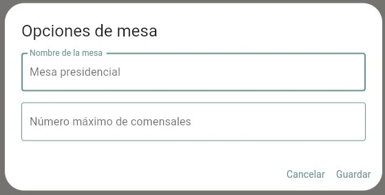 Pulsando el botón “+ mesa” se abre un modal, allí tienes que introducir el nombre de la mesa, ej. “Familia López” y el número máximo de comensales.